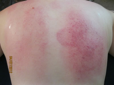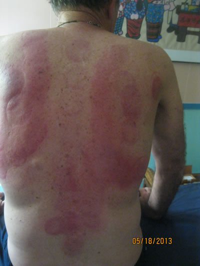 The photos above focus on the effects of cupping that produce a response primarily on the right side of the body. This is where the liver resides. The liver serves a vital function in hormone regulation, detoxification, and digestion. Chinese medicine maintains that a free flowing liver ensures proper nourishment of the body as a whole through the blood. Stagnation that is in the lower right is more indicative of a stagnant liver, as in pics 2 and 4. The third picture is shows greater stagnation that is indicative of muscular tension, since the redness runs up to the body of the trapezius. Picture three and two show strong stagnation below the shoulder, where liver toxins have a tendency to accumulate.